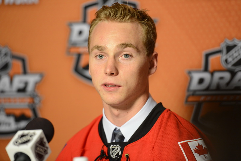 Photo Caption: Sam Bennett poses on stage after being selected fourth overall at the 2014 NHL Draft in Philadelphia. (Photo by Aaron Bell/OHL Images)