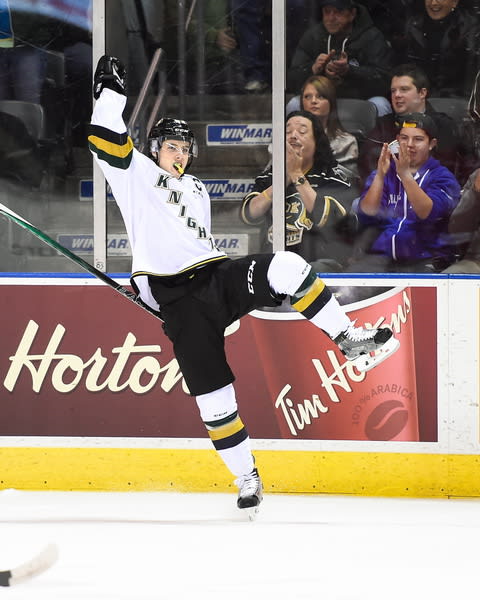 Mitch Marner launches into celebration after scoring for the London Knights during the 2015–16 season—a year that would end with OHL and Memorial Cup championships.