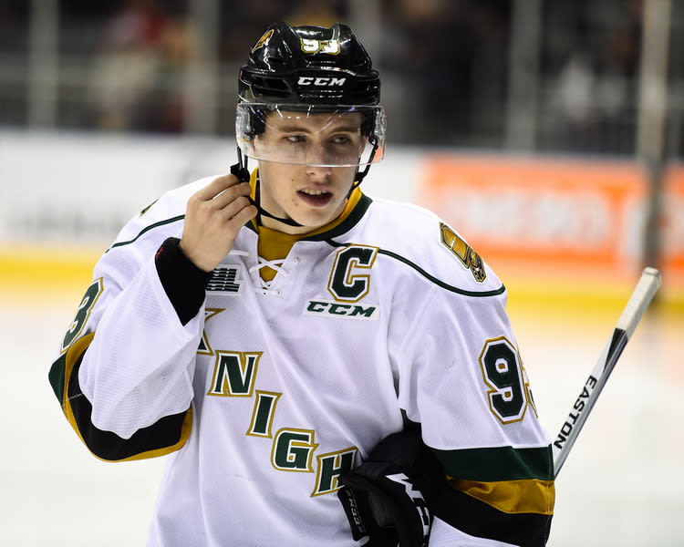 Focused between shifts: Marner adjusts his helmet during a break in the action with London. His #93 sweater became synonymous with his junior hockey dominance.