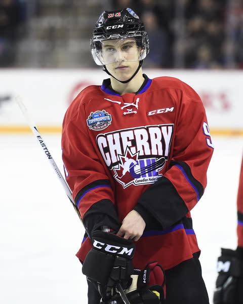 Suiting up for Team Cherry at the 2015 CHL/NHL Top Prospects Game, where he showcased his playmaking skills in front of dozens of NHL scouts. Photos: Aaron Bell/OHL Images