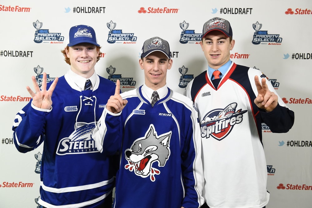 From left to right: Owen Tippett (2nd overall, Mississauga Steelheads), David Levin (1st overall, Sudbury Wolves), and Gabe Vilardi (2nd overall, Windsor Spitfires) pose together on OHL Priority Selection Day at the OHL offices in Scarborough, ON. Each player entered the league with sky-high expectations — and the first steps of a journey that would lead them to the NHL . Photo: Aaron Bell/OHL Images.